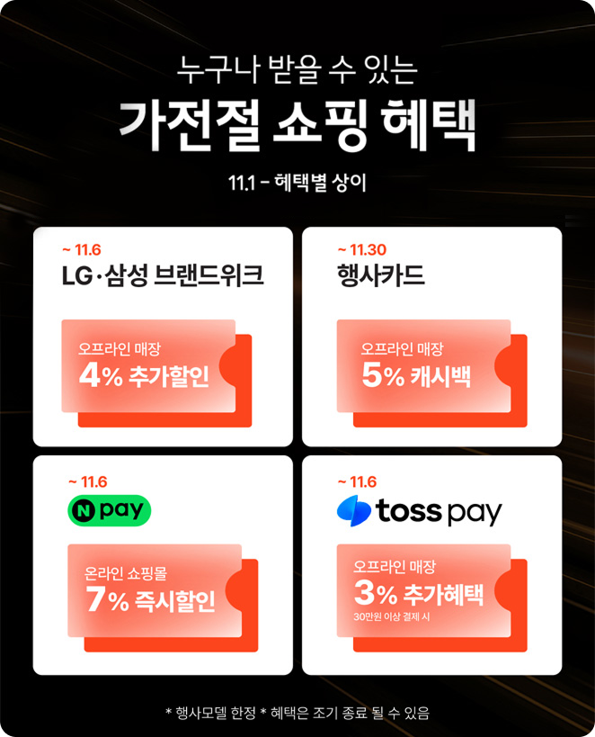 - 구매 조건에 따라 혜택 적용 여부 및 할인 금액이 달라질 수 있으니, 최종 결제 전 혜택 금액을 반드시 확인하시기 바랍니다.