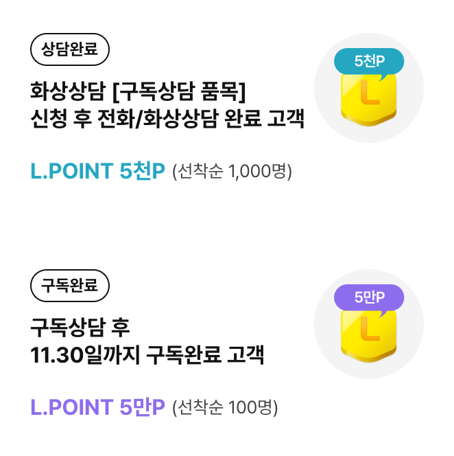 지급 조건[구독상담] 전문가 화상상담 2분 이상 상담 완료한 L.POINT 통합 회원 전화상담 지급 가능 단, 고객 상담 취소 시 지급 불가
