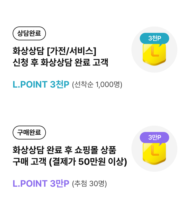 - 화상상담 이벤트는 화상상담 정상 완료(2분 이상) 고객 중 선착순으로 L.POINT지급 예정입니다.