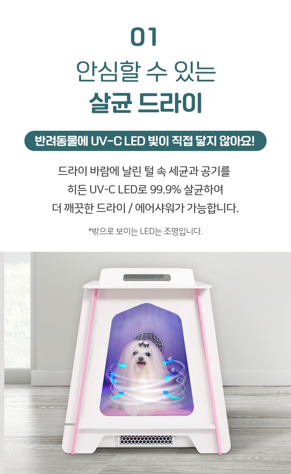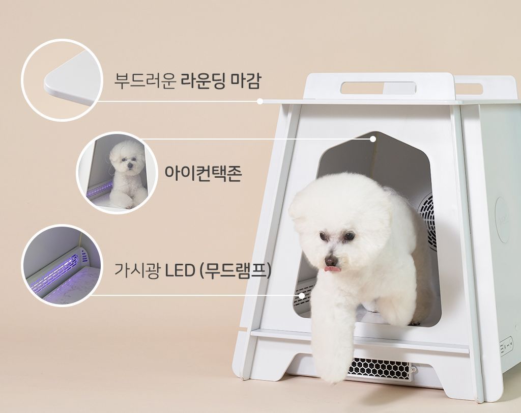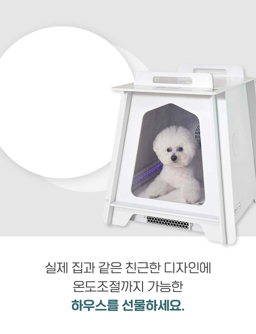 A. 반려견의 체온은 사람보다 높은 37.5도입니다. 수의사분들이 함께 참여해 반려동물들이 편안함을 느끼는 온도로 제작 되었습니다. 바람 온도가 40도가 넘어가면 센서가 감지하여 자동으로 작동을 멈춥니다.