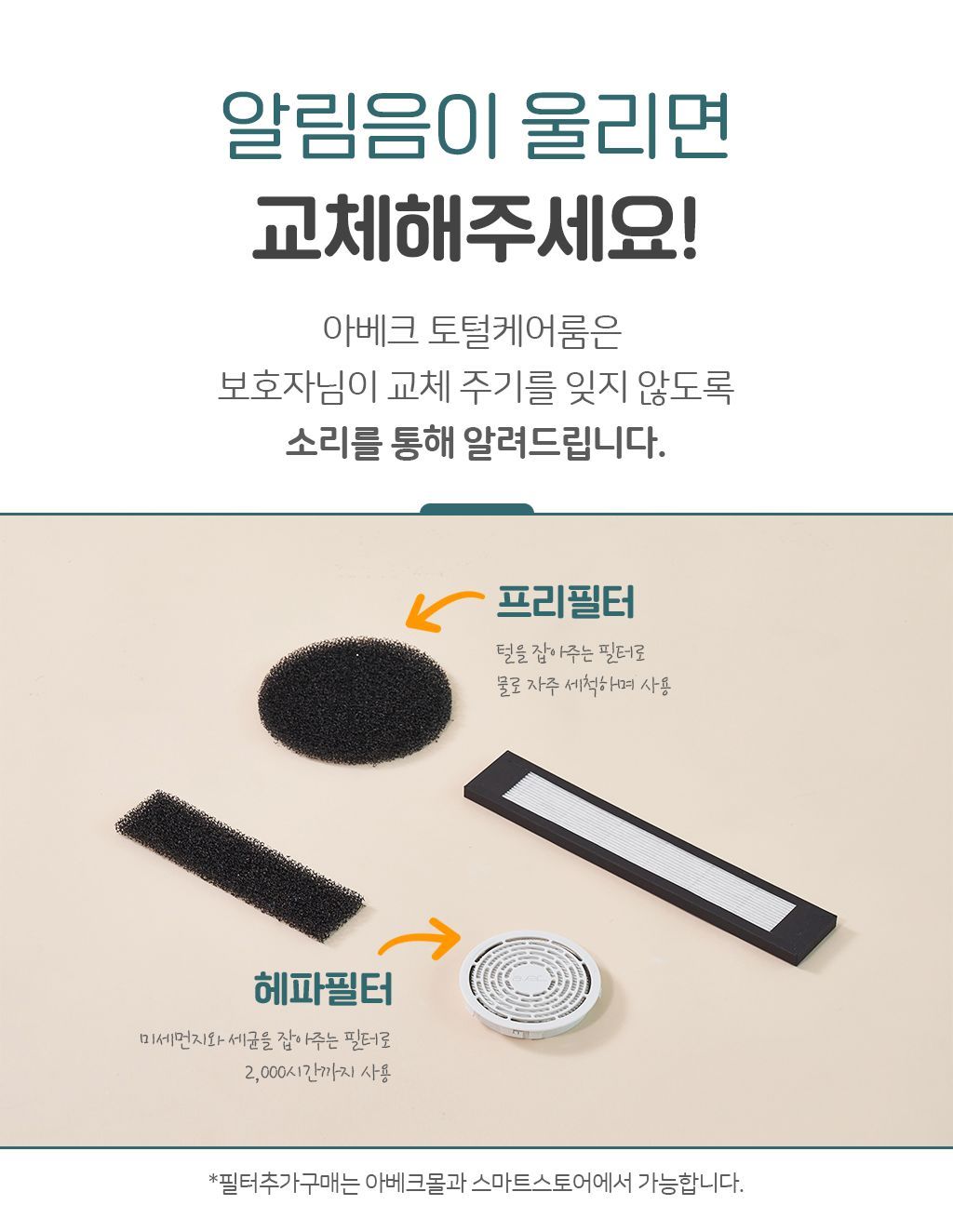 A. 헤파필터 교체주기는 2,000시간으로 보통 1년에서 1년 6개월 정도입니다. 필터 교체시기가 되면 케어룸에서 교체해달라고 맨트가 송출 됩니다. 그때 아베크 고객센터로 연락 주시거나 자사몰에서 구입하실 수 있습니다.