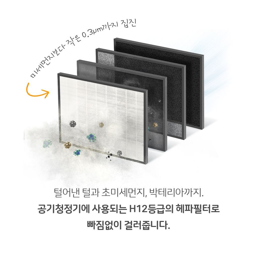 A.사람이 사용하는 공기 청정정기에 사용되는 H12 동급 필터로 초미세먼지보다 작은 박테리아까지 걸러 내는 필터입니다.