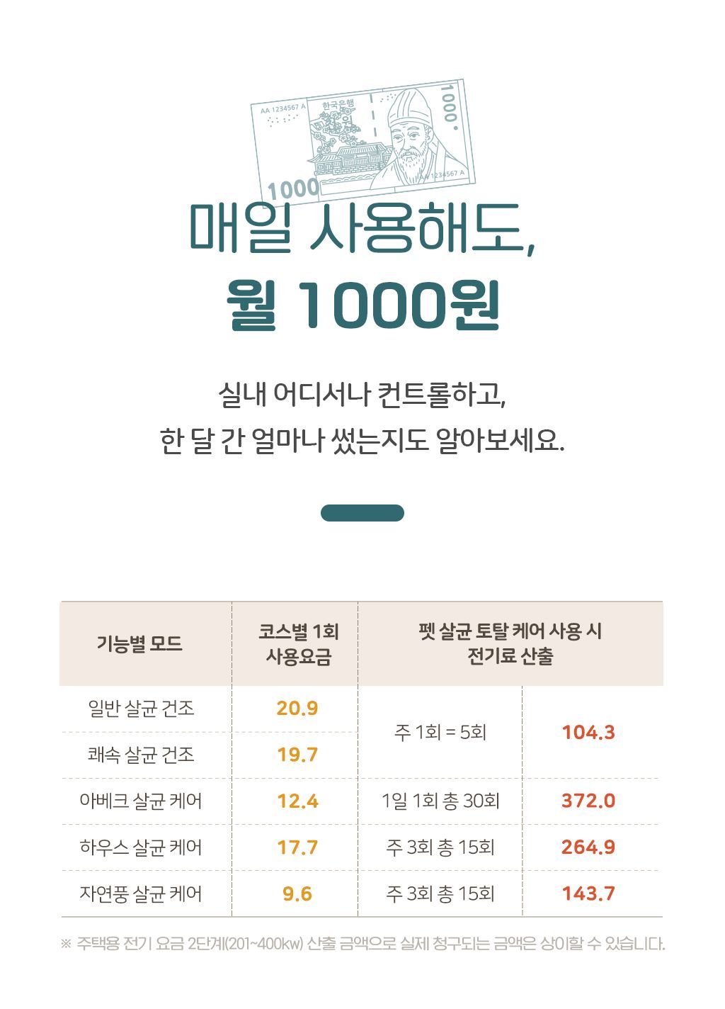 A. 한달 기준 살균케어 30회, 쾌속건조 20회, 하우스/자연풍 케어 30회 사용시 890원정도로 부담 없이 사용 가능합니다.