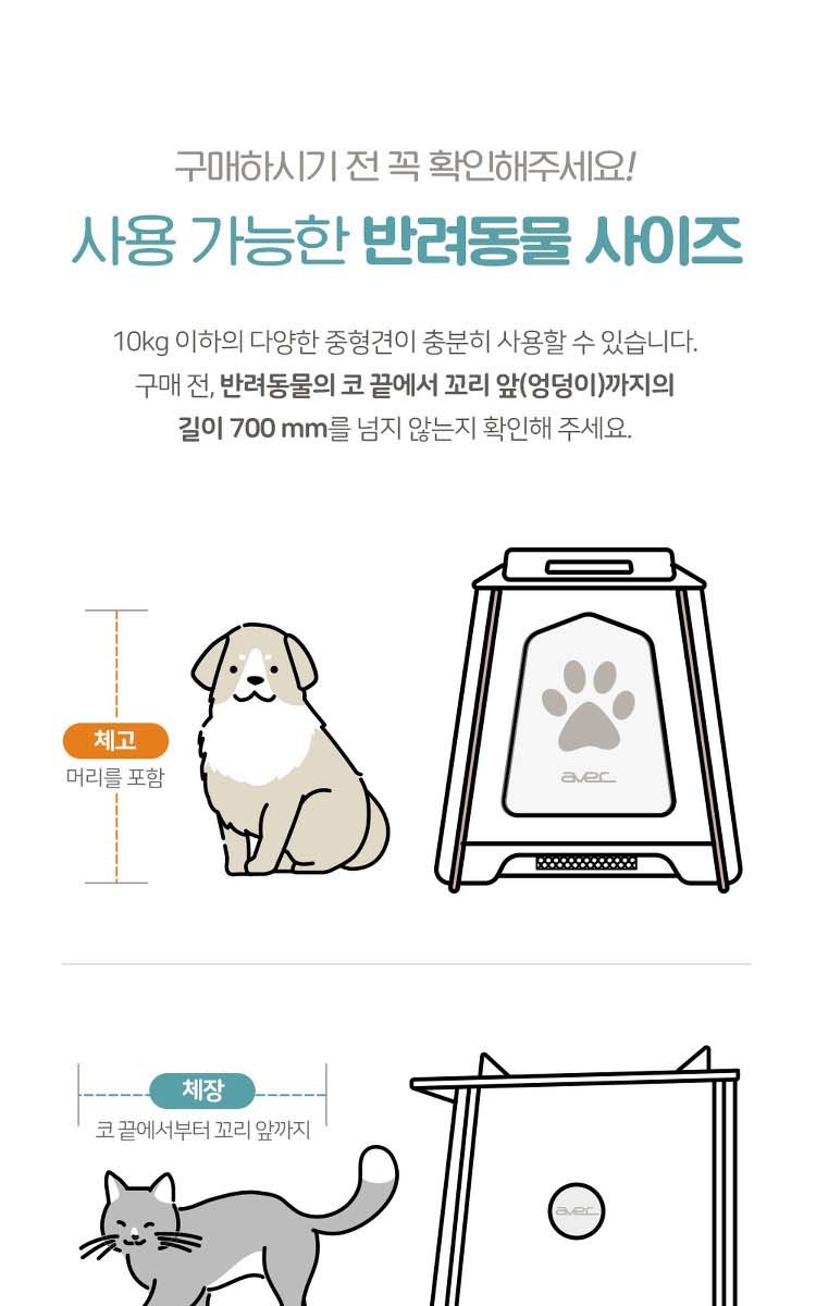 A. 반려동물의 코 끝에서 꼬리가 시작되는 엉덩이까지의 길이가 70cm가 넘지 않는지 확인해주세요. 최대 몸무게는 15kg까지 가능합니다.