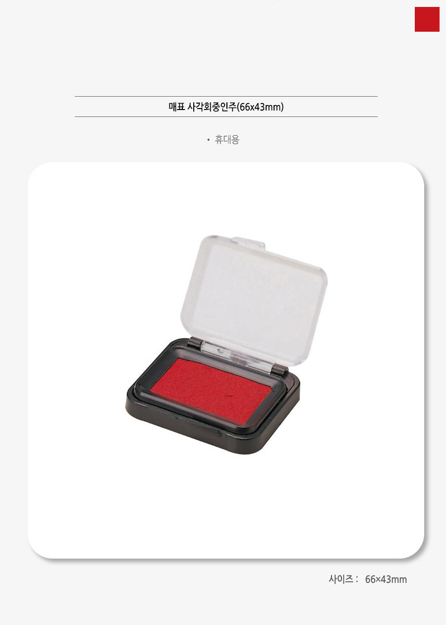 *제품설명 고밀도 고급 발포 폼을 사용하였으며 연속사용시 뛰어난 복원력이 있어 표면을 항상 새것 처럼 사용가능 날인시 잘 번지지 않고 깨끗하고 선명하게 찍힘 내수성,내광성,내약품성에 강한 불변잉크사용 색상 : 적색 규격(mm) : 122*87*15 *법에의한 인증,허가등을 받았음을 확인할수 있는 경우 그에대한 사항 - 해당없음 *제조국또는 원산지 - 중국 *수입여부 - 제이원상사 *연락처 - 1577-3397 ![]() ![]()