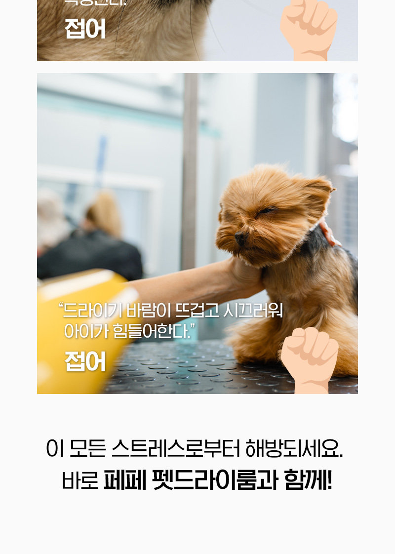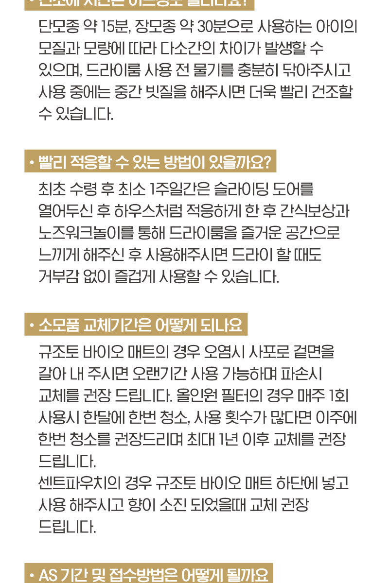 최초 수령 후 최소 1주일간은 슬라이딩 도어를 열어두신 후 하우스처럼 적응하게 한 후 간식보상과 노즈워크놀이를 통해 드라이룸을 즐거운 공간으로 느끼게 해주신 후 사용해주시면 드라이 할 때도 거부감 없이 즐겁게 사용할 수 있습니다.