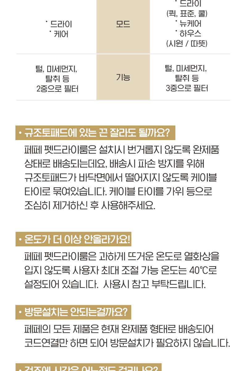 페페 펫드라이룸은 과하게 뜨거운 온도로 열화상을 입지 않도록 사용자 최대 조절 가능 온도는 40℃로 설정되어 있습니다. 사용시 참고 부탁드립니다.
