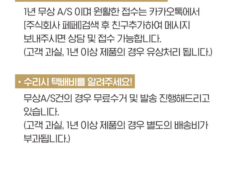 1년 무상 A/S며 원활한 접수는 카카오톡 플러스친구 [주식회사 페페]검색 후 친구추가하여 메시지를 보내주시면 상담 및 접수가 가능합니다.(고객 과실, 1년 이상 제품의 경우 유상처리 됩니다.)