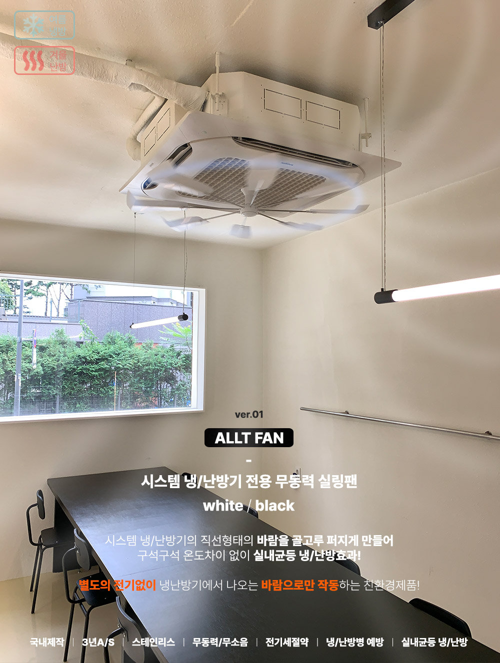올트팬은 시스템 냉난방기에서 나오는 자체 바람으로만 작동하는 친환경 제품이에요!